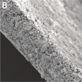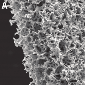 Above: Scanning electron microscope image of Alvetex Scaffold, to highlight its porous structure. A: a 200 µm thick Alvetex Scaffold disc. B: Close up of Alvetex Scaffold voids with dimensions of approximately 42 µm in diameter and interconnects of approximately 13 µm in diameter.