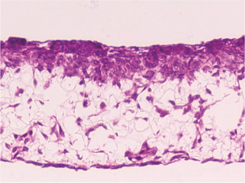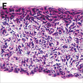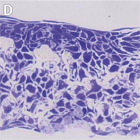 Above: Tissue processing and staining highlight the complex organization of cells growing through-out Alvetex Scaffold. D: Resin sections of Alvetex Scaffold showing skin keratinocytes stained with Toluidine Blue. E: Paraffin sectioned skin keratinocytes counter stained with H&E viewed by bright field microscopy.