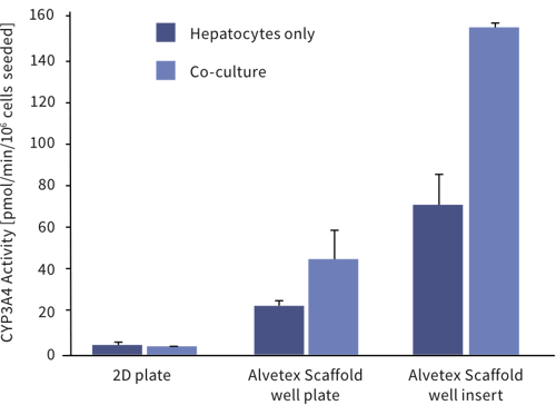Above: Metabolic responses to model toxicants were significantly enhanced using Alvetex Scaffold. Primary rat hepatocytes were cultured for 3 days in either 2D or 3D culture, Cytochrome p450 expression was induced in cells using a cocktail of model toxicants.*