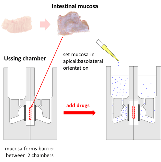 The Ussing chamber technique involves two chambers separated by intact tissue from the large intestine. Tissue integrity and viability are assessed through electrical resistance measurements (transepithelial electrical resistance, TEER), potential difference, and basal short circuit current (Isc). High-quality tissues are sourced ethically from surgical procedures or organ donors and maintained in a physiological saline solution during transport.